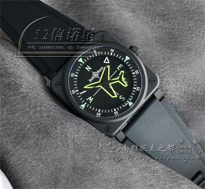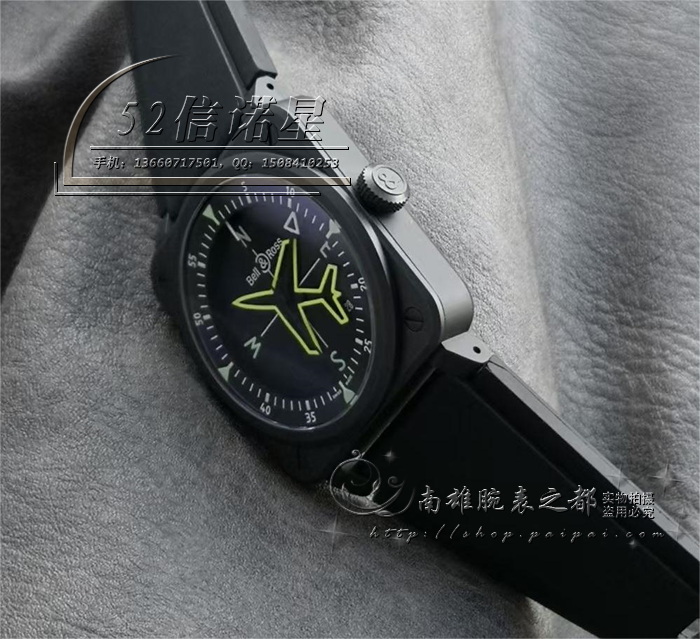 【材料】黑色陶瓷表壳、橡胶表带构造,涂层金属黄色小飞机时标,不同夜光颜色表现内置时分秒刻度。